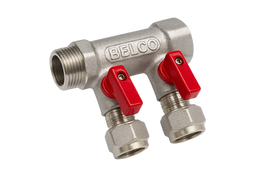 Collecteur Belco 1"F x 1"M - 2 voies - vanne ROUGE - 16 mm - tétine détachable - Corps Nickelé