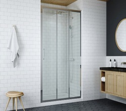 Porte coulissante pour montage entre deux murs (niche). 1 partie fixe et 2 parties coulissantes. Verre de sécurité 6 mm avec traitement anti-calcaire. Les portes se détachent par le dessous pour nettoyage facile. Profilés et poignées chromés. Hauteur 200 cm. Largeur extensible 970-1010 mm.