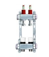 Voorgemonteerde PexxaFloor© collectoor Kit met regelbare beugels en debietregelaars op de aanvoerzijde. RVS collectoor 4/4"F x 4/4"F. Ontluchter en drain ventiel end units. Aansluitingen in 3/4" Euroconus (Euroconus fittingen niet inbegrepen). Voorzien voor 2 aftakkingen.